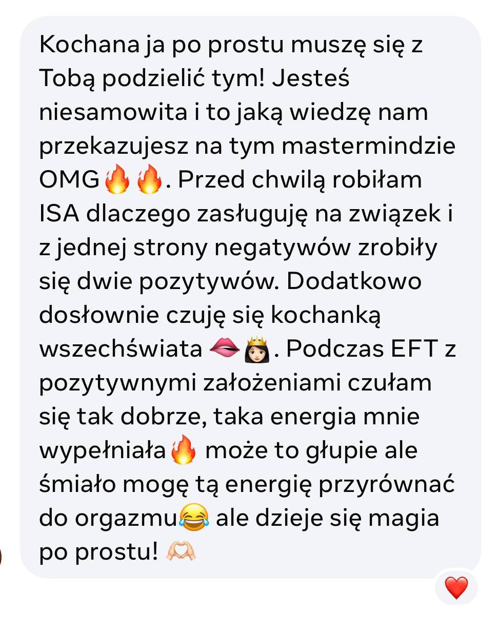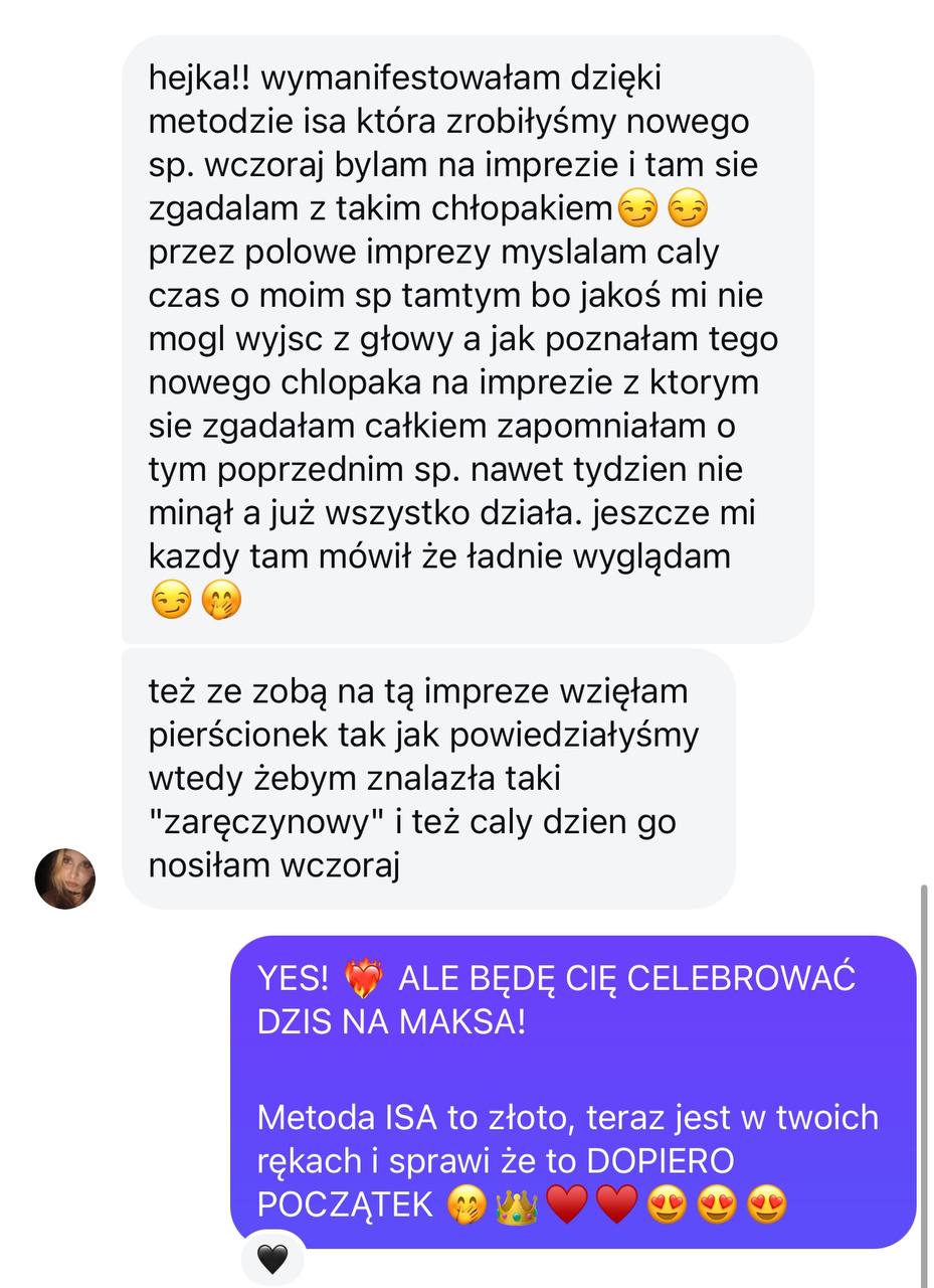 To moje klientki po 1:1 ze mną są ZAKOCHANE w moich sekretnych formułach i metodach, takich jak moja autorska metoda ISA, metoda, dzięki której ruch i zmiana w rzeczywistości zewnętrznej dzieje się NATYCHMIAST.